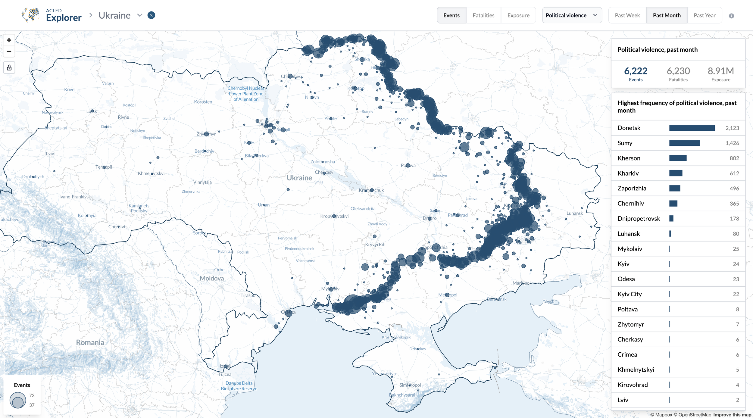 Visualising conflicts around the world by showing event frequency, fatalities and population exposure in one combined exploratory data display.